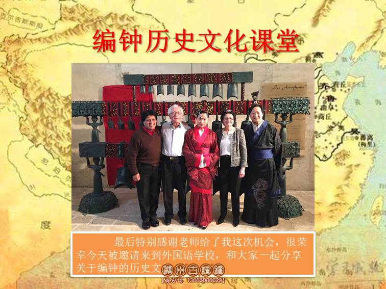 序:同學(xué)們,大家好!我是編鐘文化傳承人龔宏博,從我的父輩起就開始從事編鐘的復(fù)仿制工作,如今已有快30年了,感謝謝老師給了我這次機(jī)會(huì),很榮幸今天被邀請(qǐng)來(lái)到 學(xué)校,和大家一起分享關(guān)于編鐘的歷史文化。
