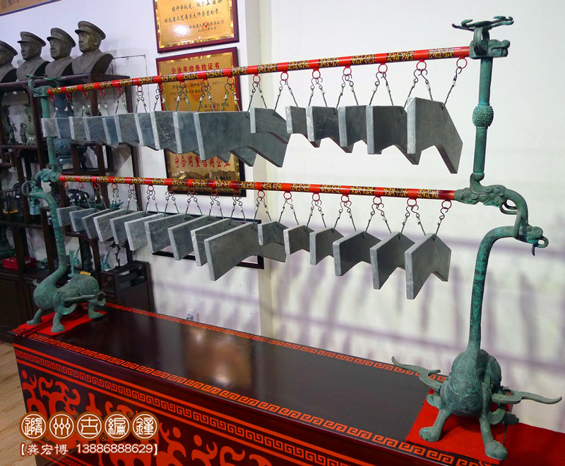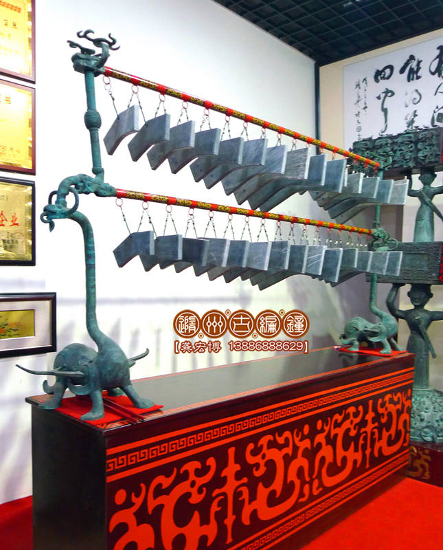 公司復(fù)原制作的32件曾侯乙編磬與原文物一致,編磬全長2.23米,寬50厘米,高1.08米;為了演奏方便,公司設(shè)計了編磬木桌承托編磬,長2.4米,高70厘米,寬45厘米,陳列編磬后總高度:1.78米。木桌內(nèi)做儲藏柜,可方便樂隊(duì)保管其他樂器及服裝,方便實(shí)用。