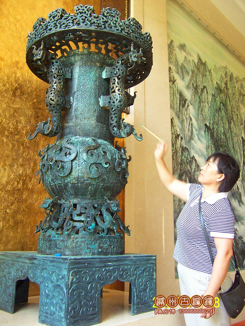 青銅尊造型端莊優(yōu)美,紋飾精巧、復(fù)雜,是現(xiàn)已出土的青銅器中最復(fù)雜、精美的珍品。尊高2.13米,敞口寬1米。尊是盛酒器,內(nèi)盛摻有香草汁的酒,祭祀時(shí)酌以敬獻(xiàn)神靈,賓禮時(shí)酌以飲客。青銅尊安裝 到湖北省接待重要貴賓的地方——武漢東湖賓館會(huì)議廳,同時(shí)訂購(gòu)的還有青銅筒形器等,這些器物擺放 在中式裝修風(fēng)格的建筑中起到了畫龍點(diǎn)睛的作用,將它們擺放在會(huì)議廳,代表湖北燦爛的歷史文化。