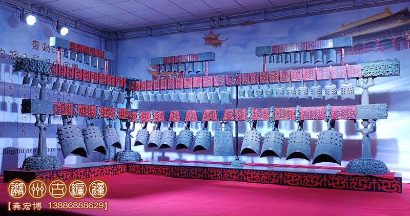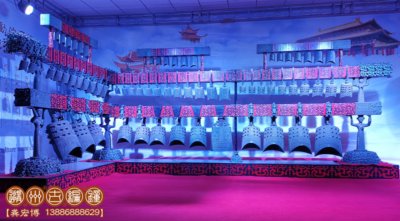 技術(shù)標準:鑄件要求紋飾清晰,表面光潔,無裂、刺、孔、糙等鑄造缺陷;整套編鐘音域5個八度,一鐘雙音,按國際標準A=440Hz調(diào)音,音準控制在±5Hz內(nèi),音色統(tǒng)一協(xié)調(diào),無雜、啞音響。其中下層13件為倍低音甬鐘,在演奏中起到烘托氣氛的作用,中層33件為中音域甬鐘,十二半音齊備,主要用于演奏主旋律,上層19件為被高音鐘和補音鐘,也是重要的半音和補充被高音音域,3組設(shè)計可以用于演奏復(fù)試旋律。其結(jié)構(gòu)、配件、銘文等全部按照曾侯乙編鐘樣式仿制。