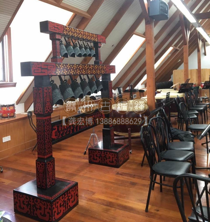 上??蛻?hù)定制的12件編鐘長(zhǎng)2米、高2米、寬0.55米,分兩層懸掛了12件青銅編鐘,每件編鐘均可發(fā)出2個(gè)不同的樂(lè)音,半音齊備,采用A=440Hz標(biāo)準(zhǔn)調(diào)音,適合小型民樂(lè)團(tuán)體使用,豐富了民樂(lè)團(tuán)的整體音樂(lè)效果,從而獲得客戶(hù)的一致好評(píng)。
